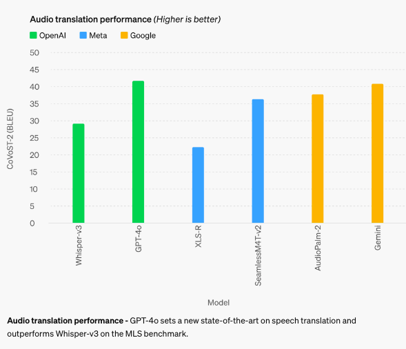 모든 언어, 특히 저자원 언어에 대한 음성 인식 성능을 Whisper-v3 대비 크게 향상시켰습니다. 이는 GPT-4o의 오디오 처리 능력이 매우 강력함을 보여주는 결과라 하겠습니다.
