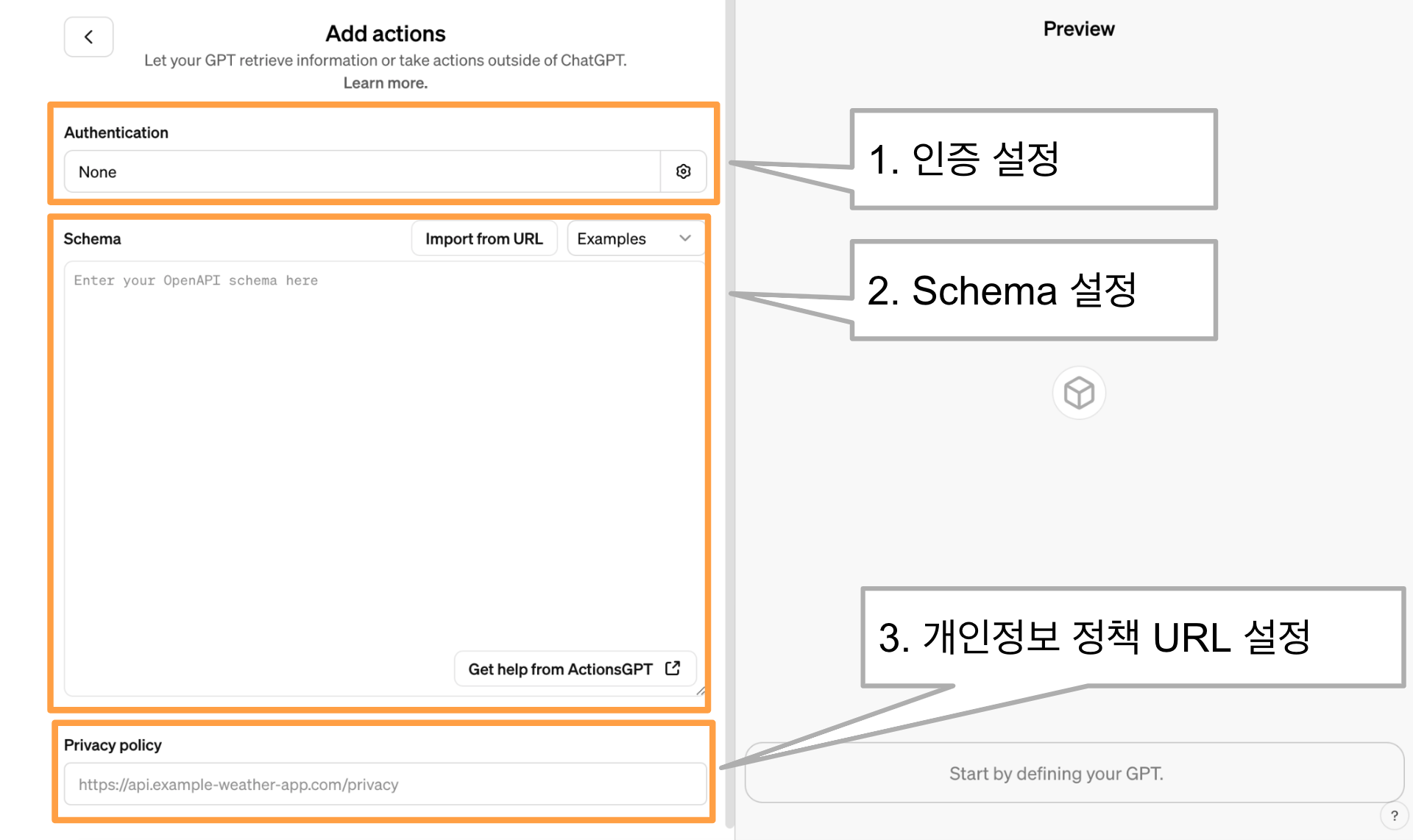 GPT가 외부 API에 어떻게 접근할지 정의하는 세 가지 주요 옵션을 설정합니다: